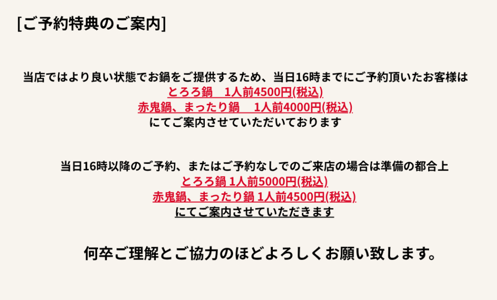 ご予約される際はお鍋の種類と何人前かももご記載ください。